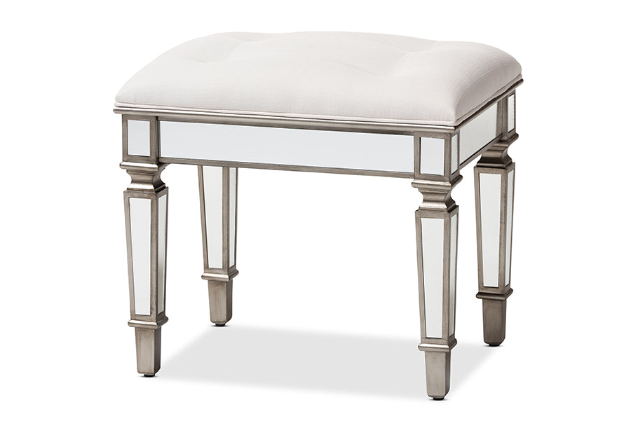 Baxton Studio Marielle Hollywood Regency Glamour Style Off White Fabric Upholstered Mirrored Ottoman Vanity Bench