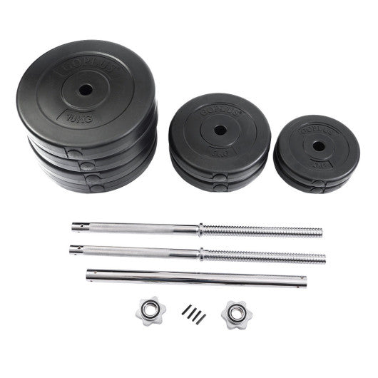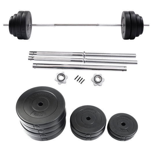 This barbell weights set is the perfect exercise equipment for your home gym. Made from sturdy steel and eco-friendly PP material this barbell set is strong and durable promising you long-lasting service. Star-locked collars ensure that the plates will not slide off when you exercise. Besides the anti-slip rods make it more stable when you are applying a big amount of pressure on it. You can choose different weights to fit your workout sessions. This barbell set is designed for all body workout such as glutes legs core arms and back. With this set you can do exercise anytime and anywhere. Don't hesitate to buy it! Get your body in the best shape possible! Made from high-quality steel making it rust-resistant and durable. Eco-friendly PP material of plates. Star-shaped collars lock the plates in one place. Anti-slip metal rods provide an extra steady hold grip. Barbell plates are not easily damaged no leakage of sand detected. Perfect for all body workout. Optional for regular home use outdoor exercise and gym classes. Choose different weights according to your physical condition and needs. Easy to assemble and store.