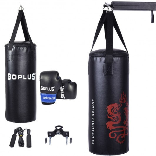 This children boxing set includes one punch bag one pair of gloves one rope skipping one rucksack and one hook. It is a perfect choice for kids workout and getting into shape. This punching bag and gloves set will accelerate kids' workouts and take the training to the next level. This boxing set is an all-inclusive kit for combining an upper body and cardiovascular workout. The training gloves protect your hands while you practice. And a rucksack is provided to storage you sandbag when do not use it. If you are looking for a product such as this don't hesitate to buy it! Brand new and high quality Including one punch bag one pair gloves one rope skipping one rucksack and one hook Perfect for children workout and get into shape Skipping Rope is good for warm up before boxing. Training gloves protect your hands while you practice Fit for Junior Children over 5 years old