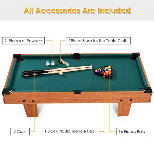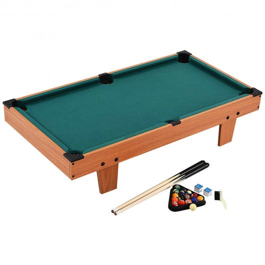 The 36" table top mini pool table is sure to be a big surprise to the kids!   It is a perfect gift for your children giving them a chance to experience the fun of billiard. It can help your children understand the rules of billiard game and train their interest in pocket ball. This mini size billiard table enables storage easily. You can simply place it under the bed or in the top of cupboard when it's not in use. The portable table brings condensed fun in any place.   Don't hesitate to buy it!   Brand new and high quality Mini size won't share too much space of your house easy to store when not in use Easy to play suitable for green hands to get familiar with the rules of billiards table Parent and child's game excellent interaction with your child Perfect gift to kids great entertainment equipment for children at home and parties Simply and quickly attach the legs and you're ready to play All playing equipment includes: 1 billiard table 16 balls 2 cue 1 table brush 1 rack 1 billiard chalk