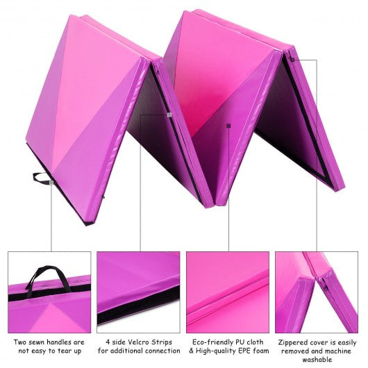 This is the 4" x 10" x 2" folding foam mat which is excellent for tumbling yoga aerobics pilates martial arts dance and more. You can put it on anywhere for its folding 4-panel compact storage design. Also you can carry it to go hiking for its handle and folding design. Wih high quality PU leather cover and high-density EPE foam filler this gymnastic mat will be soft and durable which can be used for a long time. You can enjoy your exercise time with it. Also it is also perfect for teaching basic gymnastics and exercises to kids. Have you been heartbeat? Don't hesitate to buy one. High quality PU leather cover and high-density EPE foam filler Folding and portable design for easy storage and transportation Velcro on 4 sides allow for connection to additional mats Easy to clean durable PU leather cover Designed for schools clubs camps teams or individuals etc