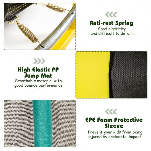 The recreational trampoline gives a wonderful childhood for your kids! This kids trampoline is made of galvanized steel frame which is sturdy and weather-resistant for long-term use. With 3 durable U-shaped legs it gives a stable construction and provides a load-bearing capacity of up to 275lbs. Besides the 360 degree safety enclosure net provides kids with a safe and visible jumping environment. The EPE foam protective sleeves strengthen the impact protection to prevent kids from being injured by accidental impact when jumping. Moreover all springs are covered with safety covers eliminating the risk of children's hands or feet being caught in the gap. This kids recreational trampoline can not only allow kids to play with their friends to spend happy leisure time but also make them fall into love with exercising and improve balance and coordination skills. Let your kids enjoy the jumping time! If you are looking for this product don't hesitate to place an order! 3 U-shaped legs provide greater stability to prevent tipping over No-gap design prevents kids from getting stuck L-shaped double-sided zipper is easy for kids to access to the trampoline Weather-resistant trampoline suitable for indoor and outdoor 360� enclosure net and EPE foam protective sleeves gives a safe sports environment Heavy springs have better elasticity and deformation resistance Breathable PP jump pads provide superior bounce performance Rust-resistant galvanized steel frame for longer service time Frequent jumping help to strengthen their balance and coordination capacity