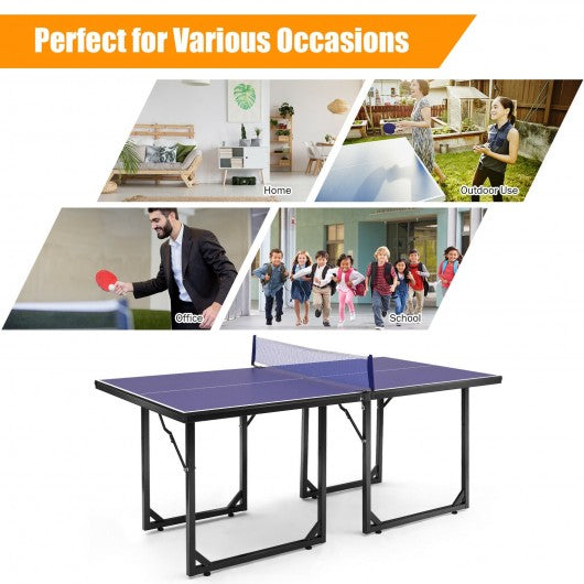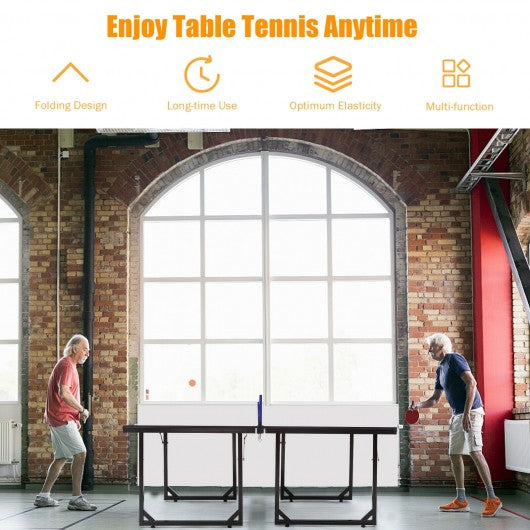 The midsize table tennis table is composed of two independent halves which is suitable for small venues to exercise and entertain. As a fast-paced game table tennis can enhance your hands and eyes coordination reaction time and stamina. If you want to play and have one at home or office this table tennis table can give you a different sense of sports experience. It can easily be folded up and placed upright to save space. It's no need to be installed just simply unpack unfold set up the net set and play. This table tennis table will be your great choice. Don't hesitate to buy one! Two independent halves which can be used alone as a general table Small living areas with little storage space which is convenient to be folded up to save space No assembly - net included just unpack unfold the table legs latch the two halves together and attach the included net then start playing Durable steel frame construction and 1/2 '' thick MDF surface With reinforced legs and 4 rubber grips on the bottom keep things steady The four corners of the tabletop have a corner guard design to reduce the injure caused by collisions Perfect for you or your children to entertain at home