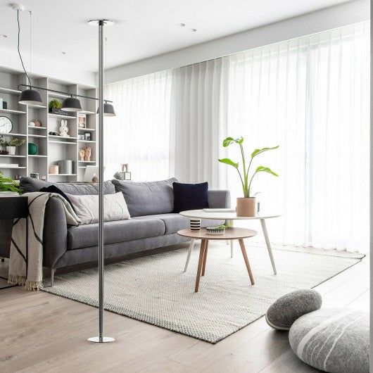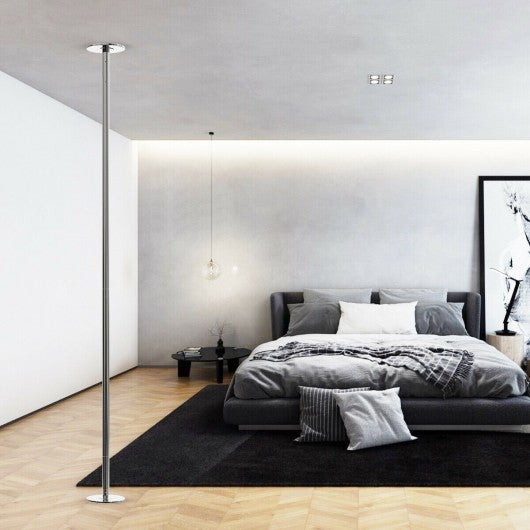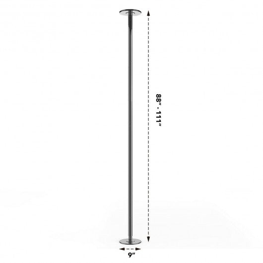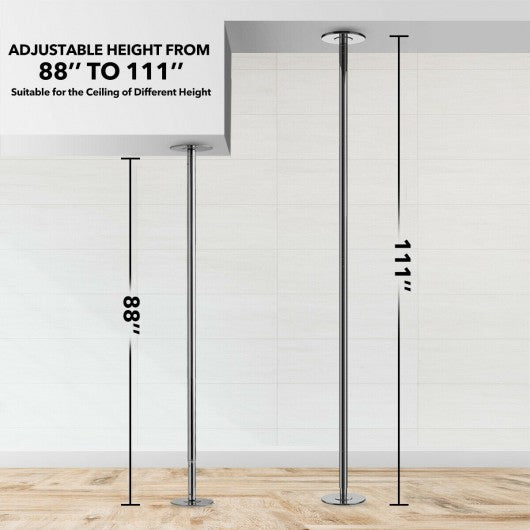 Are you bothered by tired and boring exercise? This professional stripper pole is the perfect solution for you! Combining spinning and static modes as one this portable dancing pole meets your different needs. And the adjustable height from 88" to 111" suits the ceiling of different height. This premium dance pole will not scratch your ceiling and floor thanks to its anti-slip silicon ring around the top and bottom. Made of heavy duty iron with electroplated chrome this fitness exercise dance pole is durable and stable enough to hold up to 440 lbs. With the simple and practical design this stripper pole can be used by beginners and professional dances in home gym club and other places. Satisfies your different needs with spinning and static modes Suitable for ceiling of various height due to its adjustable height design Protects ceiling and floor from scratches with non-slip silicon rings around top and bottom Heavy duty iron with electroplated chrome for durability and stability Easy to grip with 45 mm/1.7 inches iron tube Straight surface polishing to increase gloss Anti-corrosion and anti-rust surface and silver shape make it more dazzling Detachable and portable design allows you to bring it wherever you want Can be used by beginners and professional dancers Perfect for home gym club and other places Convenient to install with clear instruction