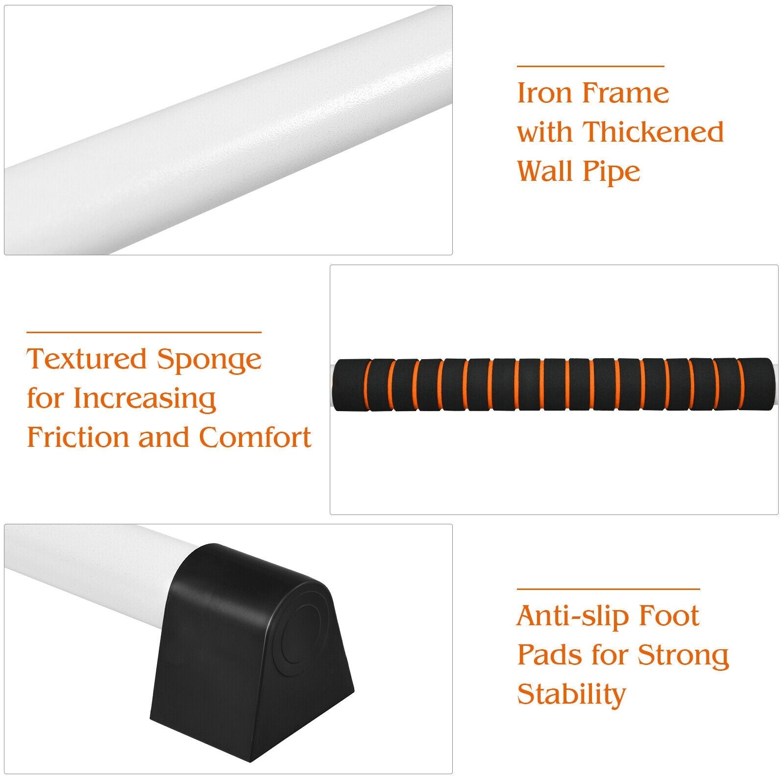 This dance barre is made of anti-rust iron pipes with 4 anti-slip footpads which are stable to ensure safety while dancing or stretching. And the dance bar has two height-adjustable rails that you only need to turn the knob to adjust to a suitable height. In addition its assembly and disassembly are very easy which is convenient for you to carry to different places such as home dancing studio and school etc. If you are looking for a product like that do not hesitate to buy it! 2 adjustable bars meet people of different heights 6 fasteners for easily adjust the suitable height 4 anti-slip foot pads ensure strong stability for different workouts Holds up to 220 lbs with sturdy and anti-rust iron frame High-density sponge for maximum comfort while using Allows you to store it with ease thanks to its base rotation system Painted with premium rustproof lacquer no smell and no harm to body or environment Provide an ultra-comfortable surface that can prevent from slipping off Suitable for home dancing studio and school etc Convenient to disassemble for easy carrying