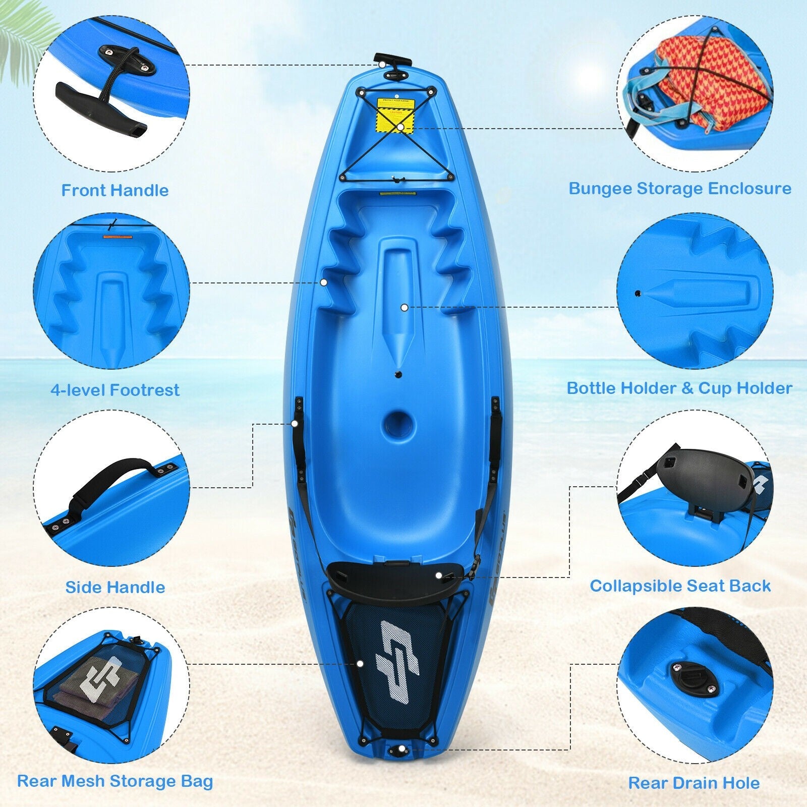 This 6ft sit-on-top youth kayak is highly functional for kids to surf and track. Crafted with durable HDPE material this sit-on-top kayak can withstand weather resistance and long-time using. Featured with 4-position footrests a folding backrest and large storage space this kayak provides your kid with a gleeful tour in leisure time. The color is eye-catching for parents to supervise their kids. What's more its lightweight design rear casters and front carrying handle make it easy to move and transport. With a bonus double paddle paddlers are ready to hit the water right away! This youth kayak is specially designed for your children taking them to enjoy exciting paddling and beautiful scenery! If you are looking for a like this do not hesitate to place an order! 4-position footrests and folding backrest provide comfortable positions for your kids Premium HDPF material makes the kayak light and durable for long-term use Front carrying handle and rear casters ensure easy transportation Front and rear hitch for personal items storage while rowing Bright color attracts kids and makes adults catch an eye easily The cup holder and bottle holder ensure easy access and better fixation Recommended for a kid over 5 to play under parent's supervision The drain hole at the bottom of the kayak makes sure the safety of your kids