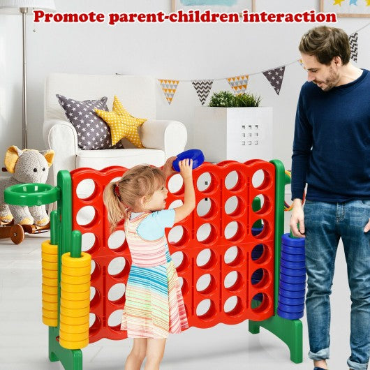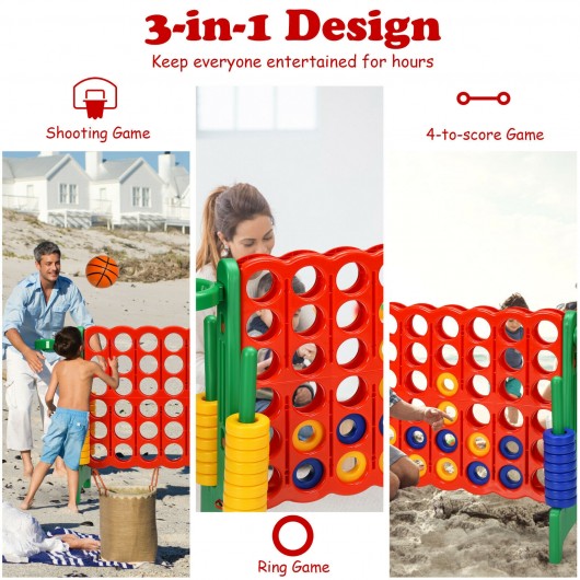 Compared to other traditional 4-to-score game sets this 4-to-score giant game set comes with a more immersive experience.   It keeps everyone entertained for hours perfect for both adults and kids. Made of premium PP and PE material it features a long lifespan and better toughness. For kids high-quality material is safe and nontoxic for long-time use. Plus it assists children in ability development. By aligning four pieces in a row and blocking opponent's pieces children effectively enhance cognitive ability hand-eye cooperation logical thinking and more. Additionally it's of great ease to assemble the set within minutes without any tool. With a weight of 10lb it's convenient to carry out for outdoor use. Surely it fits in exactly with your wishes. If you are looking for a game set like this do not hesitate to place an order!   Quick assemble or disassemble in a few minutes Lightweight enough to carry out for outdoor use Wide application for home beach party school use Constructed of premium PP and PE material to last for years Have critical thinking counting observation abilities enhanced Two quick-release slides make it convenient to reset the game Perfect for both adults and kids as well as indoor and outdoor play Oversized version of the classic 4-in-a-row game for a special using experience 3-in-1 design of 4-in-a-row game shooting game and ring game for more fun