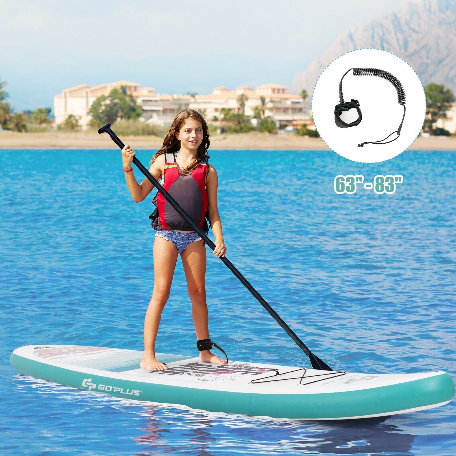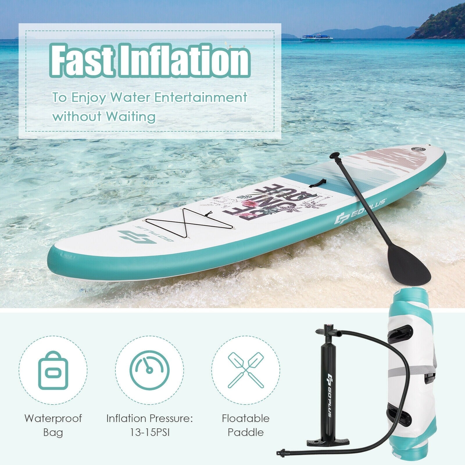 The inflatable stand-up paddleboard is ideal for water activities such as padding water yoga fishing and water sunbathing. It can be inflated quickly with the hand pump and deflated with a valve wrench. So you can pack the inflatable sup into a carrying bag with other sup accessories. This board has a large bearing capacity due to its premium PVC material and drop-stitch construction suitable for more people to ride on. Three removable fins control surfing speeds and directions easily. And widened design makes you keep balance and stable standing on it. A safety leash and non-slip deck provide people of all skill levels with a safe surfing experience. You may want to stand on it for fishing and the bungee cords can fix your necessities in order. If you are dreaming of a cool water experience in summer this sup will be a terrific product for you to choose from! Multi-layer PVC material and drop-stitch construction make it durable Non-slip EVA deck enhances friction during surfing The widened design ensures higher stability and balance The floatable aluminum paddle could be adjusted to fit all users A waterproof carrying bag is included for easy storage and transportation A convenient handle allows users to carry this lightweight SUP easily A leash could effectively improve safety Complete sup accessories are essential and practical for water activities Perfect for water surfing water yoga sunbathing fishing and so on
