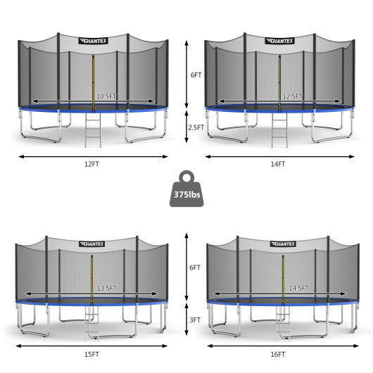 Specification: Color: As Picture Show Material: PP + EPE + Steel + PE + PVC 12': Product Dimensions: 12' x 8.5' (D x H) Jumping Area Diameter: 10.5' Spring Length: 5.5" Enclosure Net Height: 6' Spring Amount: 64 Net Weight: 118 lbs 14': Weight Capacity: 375 lbs Product Dimensions: 14' x 8.5' (D x H) Jumping Area Diameter: 12.5' Spring Length: 6.5" Enclosure Net Height: 6' Spring Amount: 80 Net Weight: 138.5 lbs Weight Capacity: 375 lbs Suitable Age: 6 years old+ Package includes: 1 x Trampoline 1 x Trampoline Ladder 1 x User’s Manual