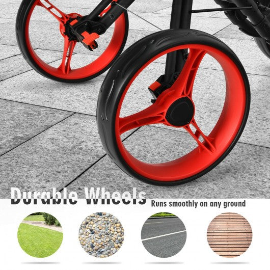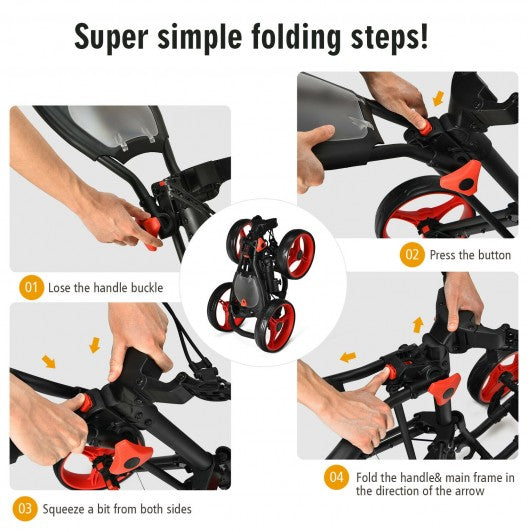 No more awkwardness on the course as you cart your clubs around the green. The smart features such as a built-in phone holder umbrella holder scorecard holder and beverage holder fulfill the expectations that go along with the multi-functional golf pushcart. Furthermore it has four high-density and durable EVA foam-covered wheels with ball bearings that provide a smooth ride and perfect traction on all kinds of terrain. This golf pull carts collapsible golf bag push cart features an ergonomic padded height adjustable handle for multiple pushing positions and to accommodate users of different heights. With a max weight capacity of 30lbs it is a great helper for both beginners and advanced golf enthusiasts. Sturdy aluminum construction with a high load-bearing capacity Wear-resistant EVA wheels with shock absorption Upper & lower brackets w/ elastic strap could fix any size of golf bag Big φ11.4” rear and φ10.4” front wheels with anti-slip texture Adjustable handles suit different heights of different people The quick brake mechanism make it stop firmly without sliding Foldable design makes it very easy to store and carry Adjustable umbrella holder always keep users from harmful rays A waterproof storage bag holds all your items safely Comes with a scoreboard for you to keep all game necessaries A waterproof storage bag and a cup holder included is perfect for users Rubber wrapped handle for an ergonomic grip
