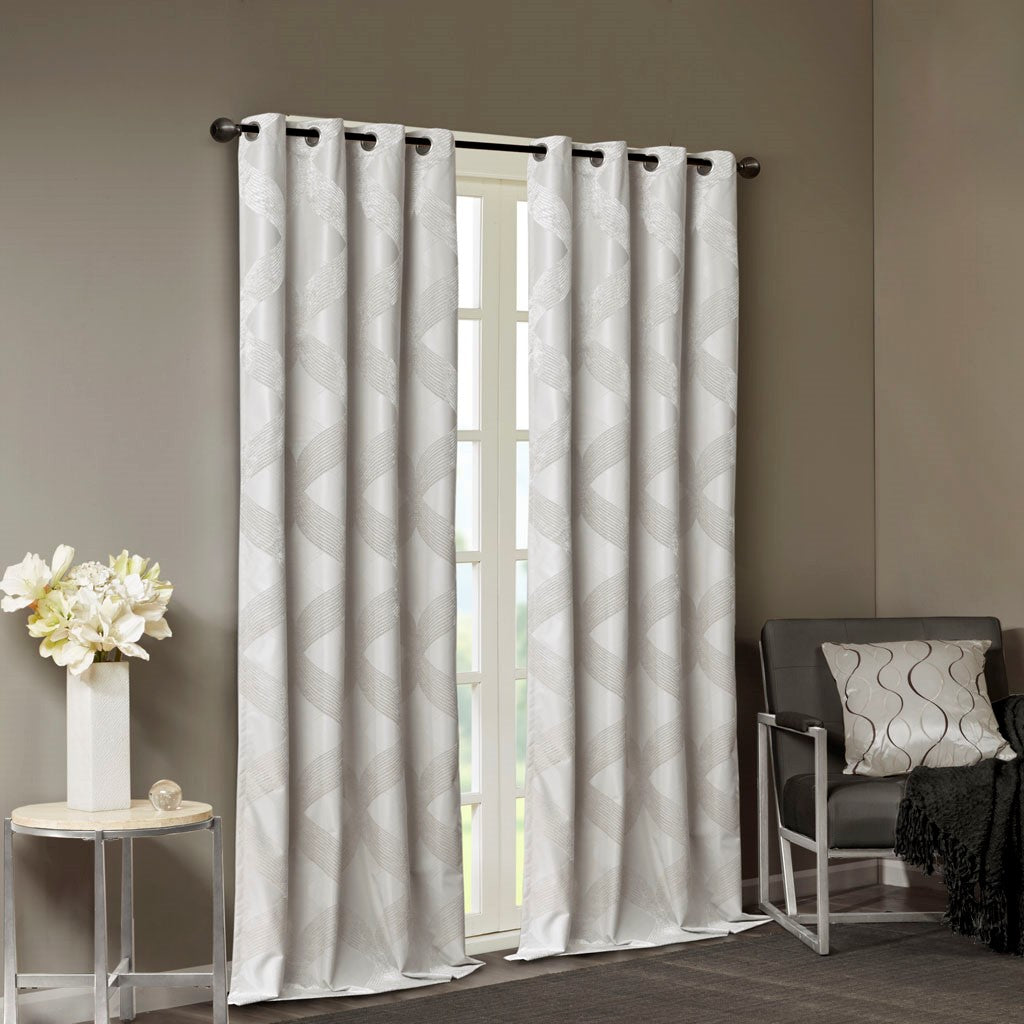 Combining luxe style with functionality, our SunSmart Bentley Ogee Knitted Jacquard Total Blackout Panel is the perfect update to dress any window. An ogee knitted jacquard design is featured in a rich ivory hue, creating a luxurious sheen and texture. The heavy fabric uses a foamback and bonding finish enhancing the panel to block out all sunlight, provide a maximum protective barrier against noise intrusion, and offer a maximum level of privacy and energy savings. A silver grommet top finish makes it easy to hang, open, and close panels throughout the day; fits up to a 1.25 diameter rod. With 100% total blackout properties, this window panel is the perfect addition for bedrooms, media rooms, or any private spaces, giving your home a lavish and contemporary appeal. Lighting level: Pitch Black Ambiance.