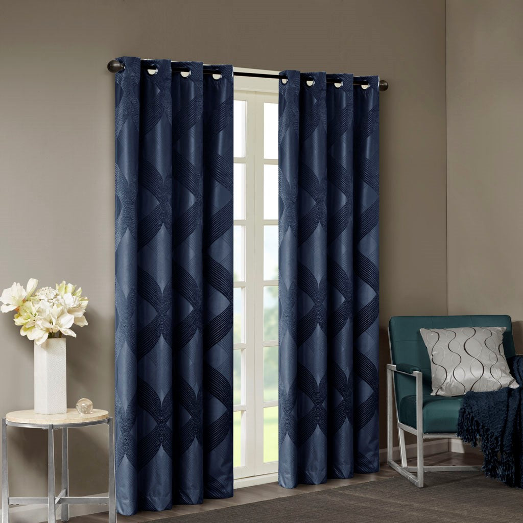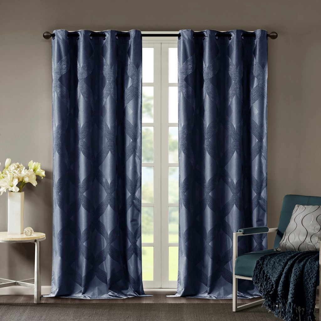 Combining luxe style with functionality, our SunSmart Bentley Ogee Knitted Jacquard Total Blackout Panel is the perfect update to dress any window. An ogee knitted jacquard design is featured in a rich navy hue, creating a luxurious sheen and texture. The heavy fabric uses a foamback and bonding finish enhancing the panel to block out all sunlight, provide a maximum protective barrier against noise intrusion, and offer a maximum level of privacy and energy savings. A silver grommet top finish makes it easy to hang, open, and close panels throughout the day; fits up to a 1.25 diameter rod. With 100% total blackout properties, this window panel is the perfect addition for bedrooms, media rooms, or any private spaces, giving your home a lavish and contemporary appeal. Lighting level: Pitch Black Ambiance.
