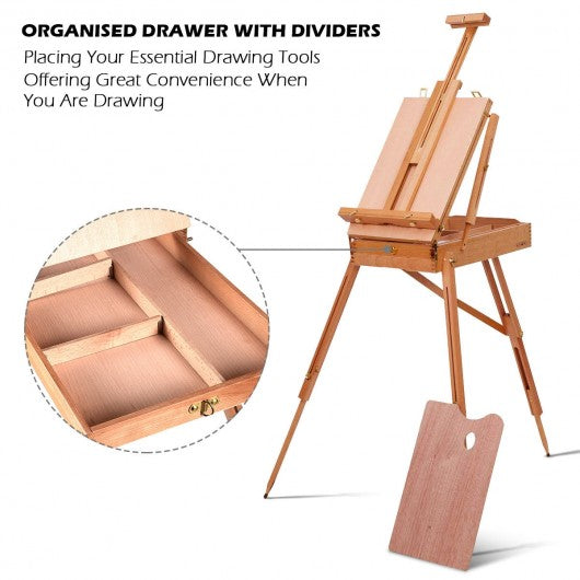 This wooden easel tripod provides a comfortable spot for either beginners or professionals to sketch indoors or outdoors. The easel finds it a convenient way to accommodate to different inclined positions for comfortable painting and drawing and adjust to different heights to suit different postures of you. All beginners to advanced learners can use it. With the built-in drawer you'll be able to have your brushes paint tubes and other necessary items in well order for easy access and a polyester allows for ease of transportation. This wood easel is great for painters who don't like being constricted to their indoor studio and like to spread their imagination outdoors. Easy to assemble Real beech wood Extends to 72" high Folds for convenient transport Brass hardware Polyester handle Divided box drawer Telescoping legs with nonskid feet Accommodates canvases to 34"