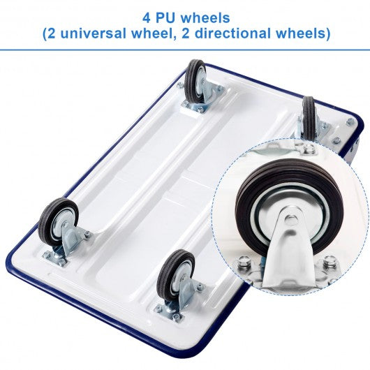 With this four-wheeled hand truck you can haul around groceries furniture luggage or office supplies effortlessly. This cart is the wonderful choice for moving heavy goods. The flat deck makes it easy to load and unload. Four wheels can provide ample stability for this heavy load when on sidewalks pavement at home or in office corridors. You can move it without much effort. Don't hesitate just go ahead buying the useful cart and ship the goods easily! Four wheels for smoothly loading on the ground Foldable handle for easy storage Flat deck makes it easy to load and unload Useful for home office and factory Compact size to be suitable to store anywhere Cart body with blue vinyl platform 4-wheel cart 2 swivel and 2 regular Swivel casters must be assembled near the side of handle