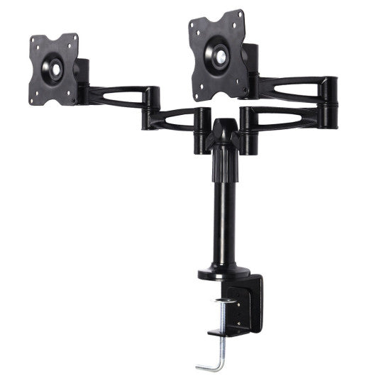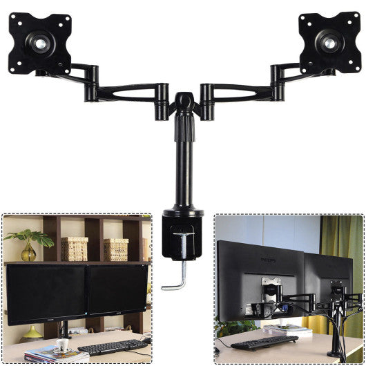 Specification: Color: Black Material: CRS(cold rolled steel) Weight limit of each mount: 18 lbs(10kg) Height adjustable from 8.7" to 14.5" Fits most flat panel monitors from 10" to 25" Horizontal size: 31"(fully extended) Package size: 22" x 10" x 7"(L x W x H) Rotation: 360° Swivel angle: 360° Unit weight: 10.2 lbs Package includes: 1 x Dual monitor mount 1 x Instruction Accessories