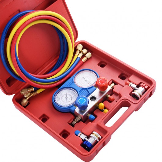 Brand new and high quality Automotive A/C Manifold Gauge Set Aluminum alloy manifold testing body with built in sight glass High or Low Pressure adjustable 3 color-coded 5 FT. long service hose with storage attachment Pressure in PSI measurement Extra large and easy to read color coded dials Each coupler have a shut off valve to prevent loss of refrigerant Solid Brass connections Ideal for R134a Quick disconnect couplers for high/low fittings included