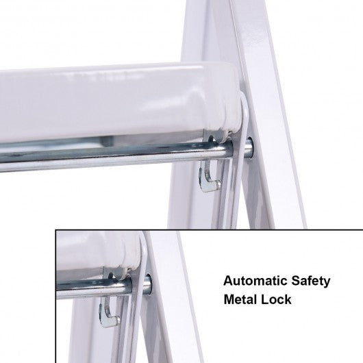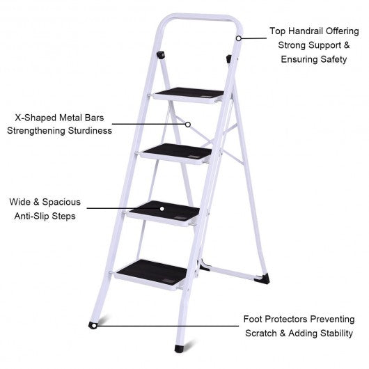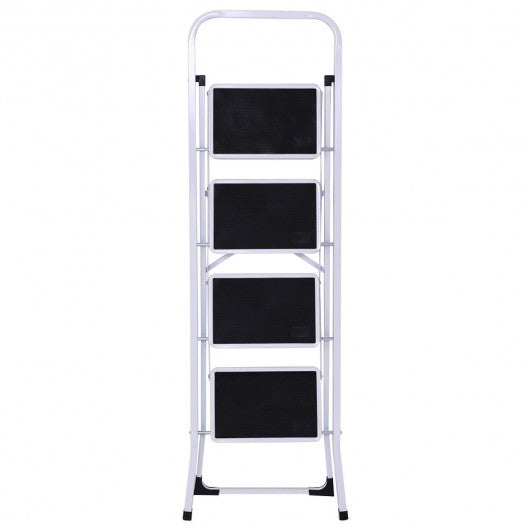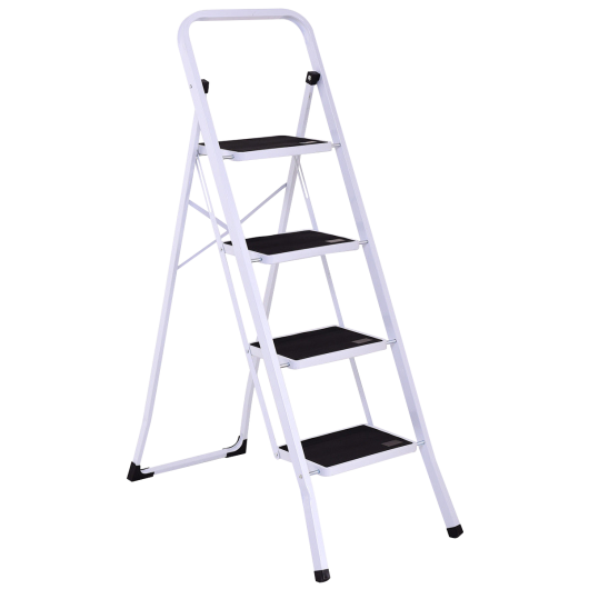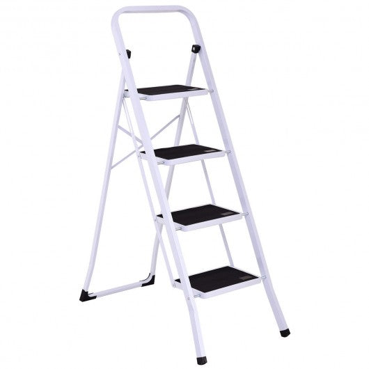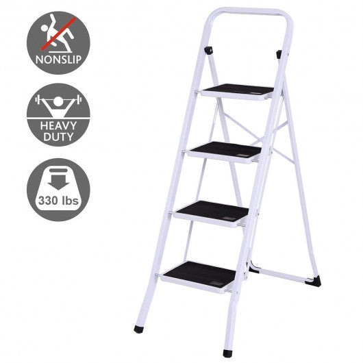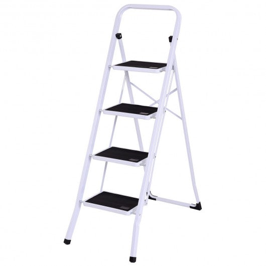 This foldable 4 steps ladder is ideal for most tasks around the kitchen office bathroom and garage. Whether you are reaching a high cabinet changing the light bulb or washing the windows this product will make it easier to get the job done. The 2-step steel stool comes fully assembled. While step ladder is engineered to be lightweight its heavy duty construction can hold up to 330 lbs. With a convenient hand grip it makes the stool easy to climb and carry. It also can be used as a chair or little pet step stool. White frame gives an attractive appearance it matches well with home decoration. Designed with non-marring feet which keeps floors avoiding scratches this folding 2-step stool also will hold up well to repeated use. If you are looking for an attractive appearance ladder here it is! It's an ideal choice either your home or shop! Brand new and high quality Modern metal design with white frame matches well with home decorate Sturdy and safe Heavy duty steel construction can load 330 lbs Convenient hand grip for easy to climb and carry Curved legs and cross back take more stability 4 wide steps with gripped treads to prevent slipping Anti-mar feet protection to protect floor from scratching Folding design for easy storage and transport Perfect tool when you reach items to a little extra height in the kitchen bathroom office garage or warehouse Easy folding capability combined with a locking mechanism to ensure security and stability Fully assembled