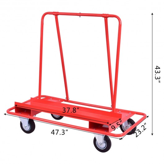 This is the drywall sheet cart which is made of heavy duty steel with red painted finish. It is constructed of steel. It is full of strength and durability and you can use it for a long time. It has 770 lbs capacity which is ideal for transporting sheet rock drywall paneling and plywood. The round corners is good to protect board or wall from damage. With this heavy duty cart you can effectively save your time and energy. It is convenient to move with two fixed and two swivel casters. If you are looking for a cart like that don't hesitate to have one! Brand new and high quality Commercial grade drywall cart with heavy duty casters Steel construction for strength and durability Rust corrosion resistance Angled deck to prevent slippage Round corners to protect board or wall from damage Can hold up to 770 lbs Easy moving 6 inch wheels (2 fixed 2 swivel) Transport sheet rock drywall paneling and plywood in narrow space Easy to assemble