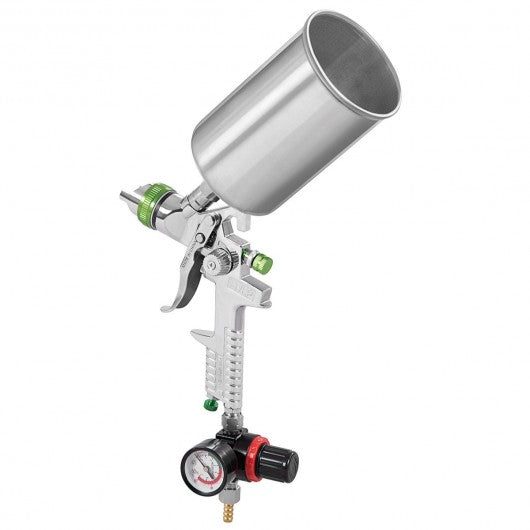 This fully atomization spray gun makes it easier for you to finish painting. Manufactured with stainless steel and aluminum cup this HVLP gun is durable and corrosion resisting. As for painting effect you can improve the accuracy of painting by adjusting three valves. The build-in air gauge is also designed for extra precision. In addition 2.5mm nozzle and 1000cc aluminum cup allows you to spray thicker material such as extreme high build or polyester primes for different painting purposes. This multifunctional spray gun is designed to meet all your painting needs like painting cars furniture crafts etc. So don't miss this HVLP spray gun to achieve your spraying desires. Adjustable control knobs make you enjoy the pleasure of spraying Large carrying capacity 1000cc aluminum cup to improve your work efficiency Unique 2.5mm nozzle for operations under a specific situation such as extreme high buildings Lightweight material greatly reduces the fatigue of your operation Easy to assemble and disassemble with complete accessories and tools Widely applied in all kinds of places to protect or decorate the surface of buildings. The silvery appearance catches your eyes and makes you love it