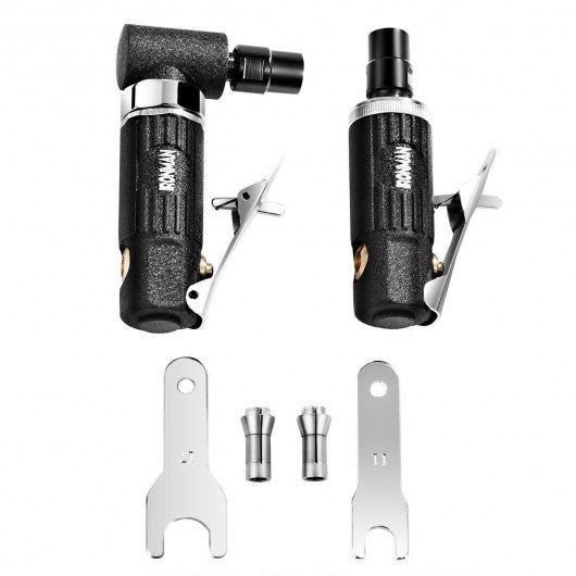 This set includes straight air die grinder and angled air die grinder which can deal with many tasks such as grinding chamfering deburring grinding polishing and so on. And it can be used in sheet metal parts metal welding parts mechanical parts various moulds and special-shaped tools. With high free speed the machine has excellent performance. By the way the front exhaust design can reduce the debris and dust so that can clean the surface clean. What's more the main body is made of the aluminum which is sturdy and durable for you long use time. That definitely can be your great helper! If you are looking for a grinder come and buy it now! Apply to multiple applications such as processing grinding chamfering deburring and grinding Integral safety-lock throttle lever prevents accidental start-up High rotary speed provides you great work efficiency Strong aluminum housing withstands tough operating conditions Ergonomic design provides you comfort of use Lightweight allows you hold with one hand easily Compact mini size is perfect for narrow space in which an angled grinder cannot reach Front exhaust can control direction of airflow and reduce the debris and dust Heavy-duty and reliable aluminum construction for long use time Easy to use with a pressure plate switch Including 1/4" and 1/8" size collets and wrenches to meet your needs