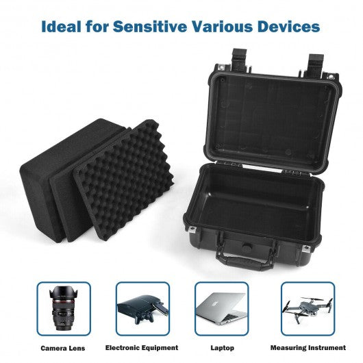 This is the camera lens case which is good for you to protect and hold the camera and lens safely. The 2 buckles firmly hold the cover to ensure it is not easily loosen or open. Besides the ip55 waterproof level allows you to take our lens box to a depth of 1 meter underwater. In addition to the waterproof features our boxes are also dust-proof and weather-resistant. In addition to protecting the lens you can also put other sensitive devices such as electronic devices laptops or measuring instruments into our multi-function box. This is the premium lens case which can provide high security for your valuables. Come and buy one! High quality pp material ensures high durability and long service life Customizable foam for different shapes items Ip55 level water protection up to 1 meter Total protection against dust and other solid material 2 buckles on the outside of the box to secure the cover Manual pressure reducing valve allows for pressure equalization Lightweight design and ergonomic handle make the box easy to carry or move Compact size does not take up too much space Suitable for electronic devices laptops or measuring instruments
