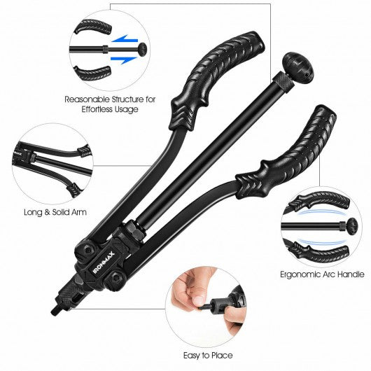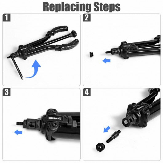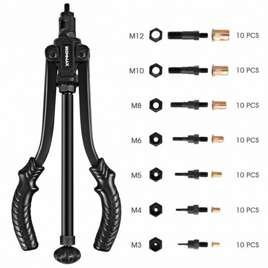 Specification: Color: As picture shows Material: Carton steel Aluminum alloy PVC Riveter dimension: 13.5" x 5.5" (L x W x H) Carrying case dimension: 16" x 10" x 3" (L x W x H) Net weight: 6 lbs Package includes: 1 x Hand riveter 70 x Rivet nuts (6-32 8-32 10-24 1/4-20 5/16-18 3/8-16 1/2-13) 7 x Mandrels (m3 m4 m5 m6 m8 m10 m12) 1 x Carrying case 1 x Multifunctional spanner 1 x User's manual