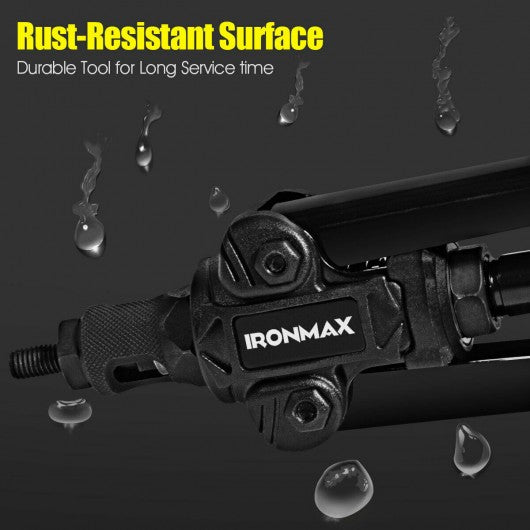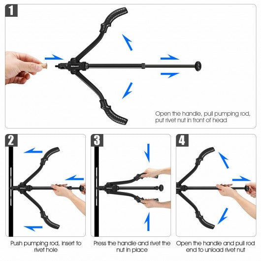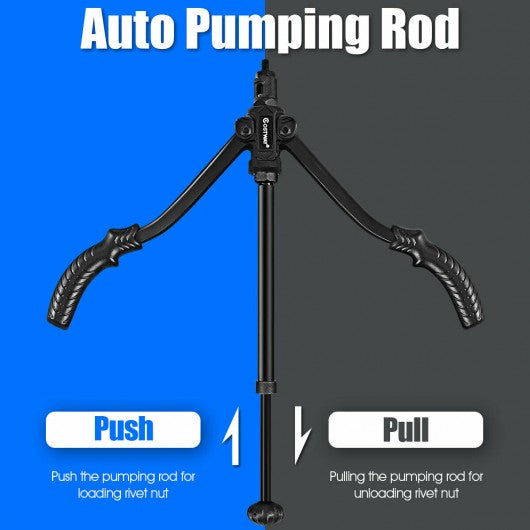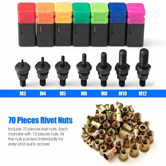 The auto pumping rod rivet nut setter kit will save more efforts than normal rivet nut tool when riveting nuts in holes loading and unloading rivet nuts. Benefiting from interchangeable mandrels and 70 pcs rivet nuts the riveter provides customizable solutions to wide range of riveting applications. Designed with quick-change mechanism the rivet nut tool provides easier and more efficient change of mandrels and nosepieces. Adopting heavy-duty carbon steel and aluminum alloy the rivet nut tool ensures solid construction. In addition rustproof surface can prevent the rivet nut tool from corrosion to offer prolonged service time. What's more ergonomic long arm will help generate more torque when you are pressing handle. More advantages of the rivet nut tool are there for you to tap into. If you are looking for auto pumping rod rivet nut setter kit don't hesitate to buy one. Auto pumping rod design more labor-saving and efficient Can be applied in wide range of riveting applications Top level configuration provide reliable using experience Each mandrel with 10 pcs rivet nuts will satisfy different demands Rivet nuts stored in independent package are easy for you to distinguish Quick-change head allows you to replace mandrels and nose pieces effortlessly Ergonomic U-shaped handle is comfortable and anti-slip Carbon steel and aluminum alloy body prevent corrosion and rust Carrying case provides exquisite protection convenient storage