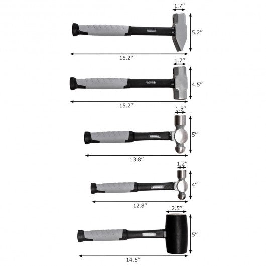 This is the 5 piece hammer set which fits perfectly for delicate or extensive jobs well. Whether you need to just tap something in place or really pound on a piece you will now have the right tools to get it done. Our hammer is well-balanced with a shock-absorbing the extremely comfortable rubber grip that allows you to work for long periods of time. The set includes a ball pein hammer two rubber mallets a sledge hammer a cross pein hammer which can meet your need for different works. If you are looking for a hammer set like that don't hesitate to buy it. Brand new and high quality Sturdy and durable heads Comfortable textured handles for handling ease Perfect for delicate or extensive jobs Ball pein hammer great for reshaping metal surfaces rounding off edges of metal pins and fasteners and riveting Rubber mallet ideal for stamping mortar beds working with timber soft metal or tiles without damaging them Sledge hammer perfect for breaking concrete and drywall driving stakes small demolition jobs and other construction work Cross pein hammer can be used to strike shape and bend unhardened metal or to shape block brick and stone