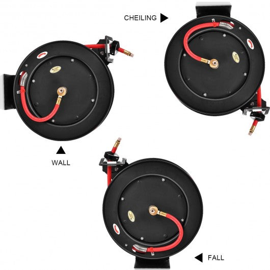 This brand new air hose reel will provide ultimate convenience for storing and working with air hose. It features fully enclosed steel alloy spring multi-position ratchet release and full flow solid brass swivel. It comes with 300 psi 50 ft. x 3/8 in. Rubber air hose. The spring powered can auto rewind. It can be mounted on the floor wall or ceiling. Diameter hose is included. If you are looking at getting a product that gets the job done don't hesitate to buy one now! Brand new and high quality Holds up to 50 ft. of hose Comes with 300 psi 50 ft. x 3/8 in. Rubber air hose Spring powered auto rewind With locking ratchet mechanism(eight locking positions) Machined brass fittings Mounts to floor wall or ceiling