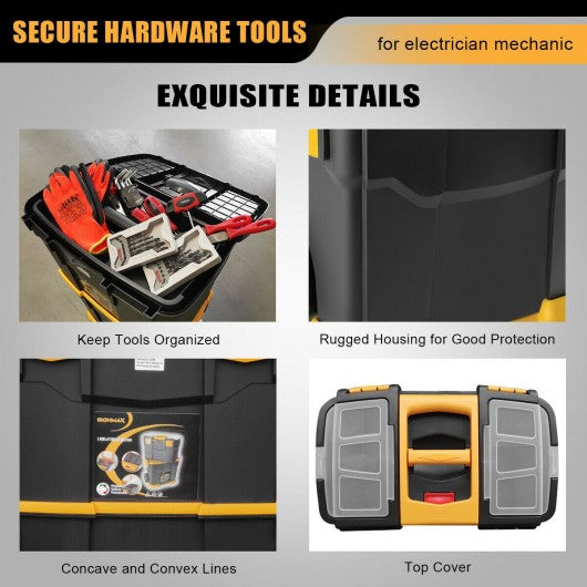 When tools increase day by day you need a large capacity tool box to be productive. This stackable mobile toolbox provides exactly what you need to get all tools done. Featuring 1 bottom pin 1 middle organizer and 1 removable top tool tray it perfectly fulfills your storage requirement. If you need to keep some small accessories organized the transparent compartments on the top will help you which allows for easy access to get them as well. More 2 smooth rolling wheels makes it effortless move the toolbox anywhere you want. While your work space may be unpredictable you will always have this trendy mobile tool box to carry different kinds of tool from one place to another. In addition rigid housing made of high quality material ensure several years of rough use while the safety locks for higher security. Other features of this functional toolbox including comfortable pop-up handle stackable design and lasting durability are waiting for you discover. 3 in 1 design compose of 1 bottom pin 1 middle organizer 1 removable tool tray With large-capacity interior storage space for classified and organized tool storage Transparent compartment on the top make small tool accessories easily accessible Smooth rolling wheels enable flexible yet effortless mobility suitable for different grounds Several comfortable fold-down handle for convenient portability Stackable and detachable design save storage space while ensuring customized usage Rigid housing and safety locks make it safe to store your tools Suitable for workshop garage home in particular tool rich men Sturdy base keep the tool box in upright position all the time