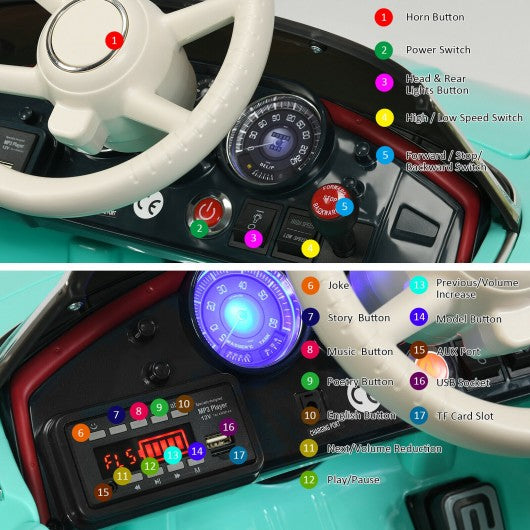 The electric ride-on vehicle has two way to operate.   Preparing a gift for your children? This BMW 507 licensed kids ride on car fits in exactly with your wishes. Parental control mode promotes parent-child interaction and ensures safety. battery operate mode allows children to play freely. In addition it is easy to operate to move it forward backward stop or turn left and right. Multifunctional ride on car with build-in music story horn headlights function and MP3 USB socket and TF card slot(TF card is not included) makes the ride more enjoyable. What's more slow start-up and suspension spring designs ensure a safe and smooth riding. The wear resistant wheels are suitable for various roads like asphalt road cement floor and brick road. Let our ride on car be a best company growing with your children.   If you are looking for BMW 507 licensed kids ride on car don't hesitate to buy it!   Two modes control not only promotes parent-child interaction but also allows children to play freely Best gift for children aged from 3 to 8 Licensed officially by BMW Scratch resistant wheels with spring suspension system suitable for kinds of pavement Designed with safety considerations such as slow start-up design doors with safety lock seat with safety belt Made of PP material kids-friendly and durable having large weight capacity Multifunctional with headlights horn MP3 music story and volume controller Easy to control it to move forward backward or stop turn left or right three-speed to adjust Pull handles and small wheels for easy movement UL certificated and ASTM certificated ride on car