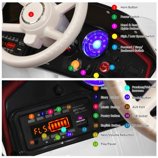 The electric ride-on vehicle has two way to operate. Preparing a gift for your children? This BMW 507 licensed kids ride on car fits in exactly with your wishes. Parental control mode promotes parent-child interaction and ensures safety. battery operate mode allows children to play freely. In addition it is easy to operate to move it forward backward stop or turn left and right. Multifunctional ride on car with build-in music story horn headlights function and MP3 USB socket and TF card slot(TF card is not included) makes the ride more enjoyable. What's more slow start-up and suspension spring designs ensure a safe and smooth riding. The wear resistant wheels are suitable for various roads like asphalt road cement floor and brick road. Let our ride on car be a best company growing with your children. If you are looking for BMW 507 licensed kids ride on car don't hesitate to buy it! Two modes control not only promotes parent-child interaction but also allows children to play freely Best gift for children aged from 3 to 8 Licensed officially by BMW Scratch resistant wheels with spring suspension system suitable for kinds of pavement Designed with safety considerations such as slow start-up design doors with safety lock seat with safety belt Made of PP material kids-friendly and durable having large weight capacity Multifunctional with headlights horn MP3 music story and volume controller Easy to control it to move forward backward or stop turn left or right three-speed to adjust Pull handles and small wheels for easy movement UL certificated and ASTM certificated ride on car