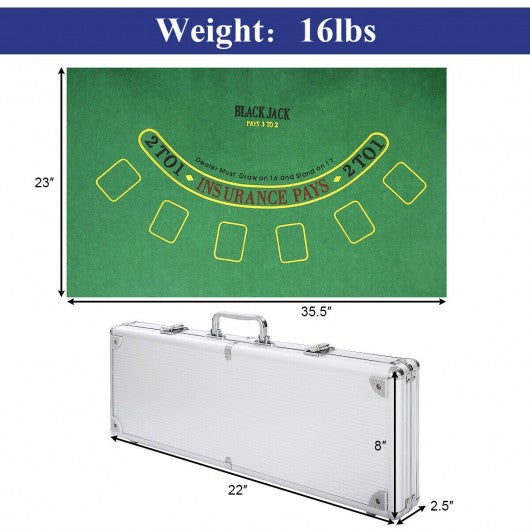 Specification: Overall size: 22" x 7.88" x 2.56" Size of velour fabric: 2.8" x 37.5" Weight of each chip: 11.5 g Net weight: 14 lbs Package includes: 500 pcs chips 1 x Small blind 1 x Big blind 1 x Dealer 2 x Cards 5 x Dice 2 x Keys 1 x Aluminum case 1 x Velour fabric 1 x Instruction