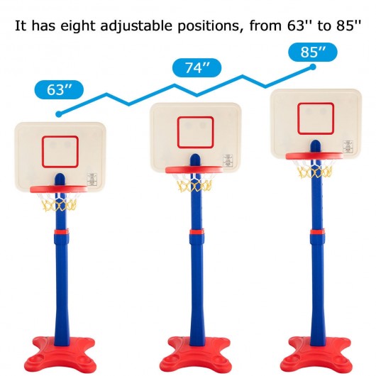 This is the medium basketball stand which is perfect for growing kids. With an adjustable height pole your kids can play it for many years. The pole can be adjusted from 63" to 85". There are eight adjustable positions. The basketball stand includes the net hoop totally a whole system. The base can be filled with sand or water to keep it upright and stable. It�s the perfect start for your little athlete because it is sturdy but lightweight to be moved. Get this basketball stand and play games in the outdoor or indoor with your kids now! Height adjustable: 65" - 85" Made of HDPE which is durable and light Weather-resistant high-impact and environment-friendly Bright colors and smooth edges Can be assembled quickly The base can be filled with water or sand for extra stability The four grooves on the base can place the things Perfect both for indoor and outdoor