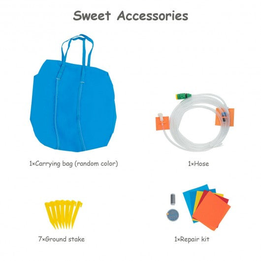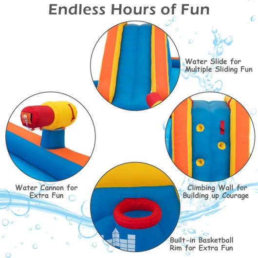 This inflatable water bouncer is made from heavy-duty puncture proof 420D oxford materials that are extremely durable and stable.   It is equipped with an inflatable water slide a rock-climbing wall and a basketball hoop which provides a safe and versatile playing space for your kids. Our popular water castle is an ideal play center for parks backyards and more. What a great present for your little ones to enjoy on hot summer days.   Don't hesitate to buy one! Your kids will love every moment spent playing in it!   420D oxford material & water-proof surfaces Two sprayers splashing simultaneously for more fun A slippery slide constructed from 800D oxford for great durability Challenging climbing wall for your children to exercises their muscles A ball rim exercising your kids' hand coordination Water cannon for a fun slide into the pool Easy to assemble & disassemble (we suggest 680W blower not included in the package) Stay cool all day with the hose connected to the tap A repair kit provides an additional security measure for emergency fixing