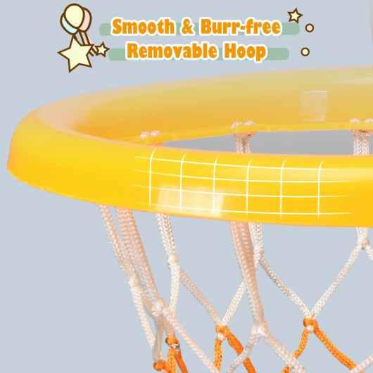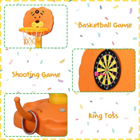 This lovely tiger basketball stand can develop kids' social skills physical coordination and balance skills. This 3-in-1 sports center allows children to enjoy happiness and confidence in the process of playing basketball throwing darts and throwing circles learning the spirit of cooperation and competition. The cute and stylish look of our basketball hoop instantly captures your kids' attention and makes your kids fall in love with basketball. There are 5 adjustable heights on the basketball stand to meet different requirements of children in different ages. The target behind the backboard is magnetic to ensure safety and enable them to practice throwing accuracy. And you can fill the base with sand or water to enhance stability. This basketball stand is the perfect gift for children! Don't hesitate to buy it! 3-in-1 basketball stand which kids can play basketball play darts play ring toss games Develop children's hand-eye coordination competition awareness and teamwork skills 5 heights can be adjusted to meet the needs of kids of different statures ASTM certified materials safe and non-toxic High-quality PP plastic as a pillar strong and durable You can fill the base with sand or water to enhance stability without shaking Lovely animal-shaped backboard and football door attract children's attention Smooth surface has no burrs to prevent the child from getting hurt The basketball net and football net are removable and washable Easy to assemble and clean saving you time and effort It includes 2 basketball 1 boomerang 4 rings and 1 inflator