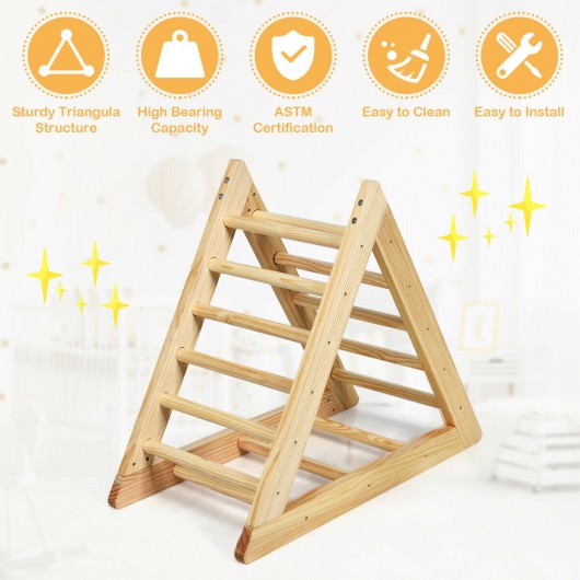 This climbing triangle is a perfect gift for children to have fun indoor! It is made of high-quality pine and the triangular structure makes it very sturdy. It is coated with non-toxic BPA free varnish and has passed ASTM certification to ensure the safety of children. With a high bearing capacity of 135 lbs it is suitable for children over three years old. It can not only increase the fun of play but also develop the child's athletic ability. There are 3 difficulty levels which is suitable for children of different ages. In addition the smooth and waterproof surface makes it easy to clean and stains can be easily removed with a damp cloth. This is an excellent toy for your child. Don't hesitate to buy for your children as gifts now! If you are looking for such product don't hesitate to buy it now! Made of high-quality pine and coated with non-toxic BPA free varnish Triangular structure and good connections provide a solid foundation Certified by ASTM to ensure the safety of children The smooth and waterproof surface makes it easy to clean With a high bearing capacity of 135 lbs An excellent choice to develop kids' muscles and motor skills 3 difficulty levels for children of different ages