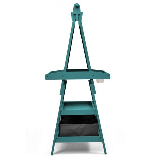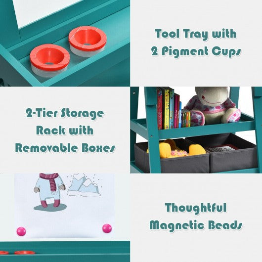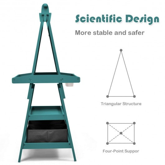 Equipped with magnetic whiteboard and chalkboard young artist can draw with his/her best friend to promote friendship. And the top roll with drawing paper provides more space for your artists to perform. The 2 trays on both sides can put various art accessories for easy access. Featuring 2-tier racks with 2 storage boxes the easel will provide spacious space to organize art supplies. What's more sturdy MDF material and stable triangle structure ensure good safety for kids to use. Let your little artists stimulate their imagination and create more works. If you are looking for easel like that don't hesitate to buy it. Double-sided whiteboard and chalkboard allows two kids to draw at the same time 3-In-1 art easel with paper roll to offer different drawing ways Made of MDF to ensure sturdiness and durability Triangle construction and tight screws for excellent stability 2-tier spacious shelves and 2 tool trays store art supplies within reach 2 removable fabric storage bins for convenient use Magnetic beads to fix the drawing paper 2 anti-spill paint cups prevent paint from splattering Rounded corners for good safety Suitable for children over 3 years old Perfect for kids' art activities in classroom preschool playroom etc Improve child's imagination and creativity Has passed ASTM certification Easy to assemble under the guidance of the manual