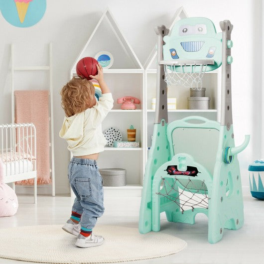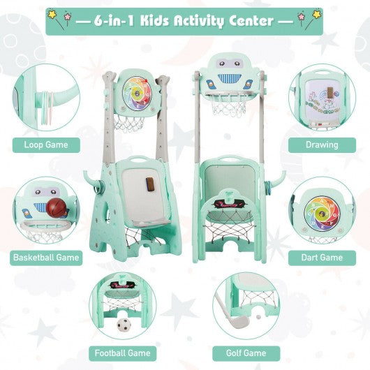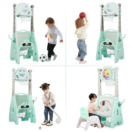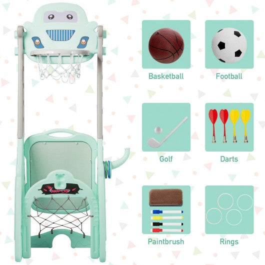 This 6-in-1 sports center allows children to enjoy happiness and develop hand-eye coordination competition awareness and teamwork skills in the process of playing basketball football golf throwing darts and rings and painting. Keep your kids happy and having fun for a long time! Children can not only play alone but also can play together with their friends relatives and parents. There are 5 different heights you can set for your lovely little one and you can adjust the height as your kids grow taller to increase the challenge. Made of durable HDPE material and stable structure our basketball hoop set can be used indoors on rainy days or outdoors when the sun is shining. This is a perfect gift for your kid�s birthday or Christmas and with the cute and stylish look it can instantly catch your kids' attention. If you are looking for this product don't heistate to place na order! 6-in-1 multifunctional activity center perfect for kids Premium HDPE material brings kids a healthy playing environment ASTM certified materials safe and non-toxic Additional heavy-duty chair helps your kids draw easily Adjustable basketball hoop perfect for kids of various ages & heights Strong basement and durable material make sure for a long service life Develop motor skills hand-eye coordination and teamwork skills Smooth surface has no burrs to prevent the kids from getting hurt Colorful appearance easily catches children�s eyes and adds more fun Suitable for both indoor and outdoor use and have great fun Easy to assemble & lightweight design for adults to move easily