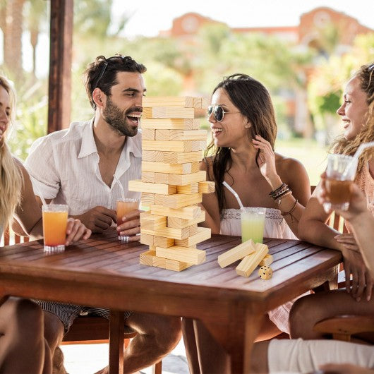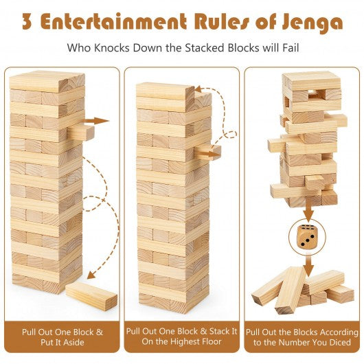 This giant tumble tower set will be your great toy addition to parties camping and events.   54 tumble blocks one dice and a carrying bag make this game fill with endless fun. Each crafted wood stack made of premium pine wood so you can use it for a long time. The block measures 1.3" x 2" x 6" and the size fits kids and adults to play together. What' s more the game has various ways to play. So you can choose a favorite playing way to enjoy. The stacking games bring everyone challenge and fun. Come with an extra carrying bag this giant tumbling timber game set can be carried anywhere as needed.   If you are looking for a giant tumble tower set like this do not hesitate to place an order!   54 pcs wooden blocks one dice and a carrying bag included 100% natural pine wood for durability and long term use Smooth surface and crafted edges ensure safety use Multiple playing ways fit all ages to play together Develop imagination coordination and logic with stacking tower game Great entertainment set for parties events and gathering Convenient carrying bag facilitates storage and transportation Detailed user' s instruction introduces various playing ways