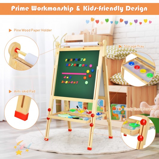 This new educational art easel is specially designed for your little ones. It's ideal to inspire children's creativity. Kids surely will enjoy hours of creative activity like painting coloring drawing lettering and math games etc and develop in fun. The double-sided design allows two kids to draw and play at the same time. The blackboard is designed for chalk and the white board is suitable mark pens. In addition kids can draw on the paper thanks to its built-in paper holder. And the art easel comes with completed accessories which include letter magnets number magnets and cartoon magnetic stickers to offer more fun. In addition the art easel features two storage trays to organize all drawing supplies and keep them within arm's reach. If you are looking for an educational art easel like this do not hesitate to place an order! With blackboard white board and paper roll for multiple use Double-sided easel for two kids to play together Adjust the height to accompany children's growth Both sides are magnetic that allow kids to stack cartoon letters and numbers magnets to the board and learn Anti-skid pads enhance overall stability and prevent slipping With completed accessories for a better using experience Supported by sturdy pine wood to last for years and avoid breaking Storage tray keeps all drawing supplies organized and within arm's reach