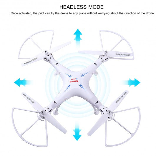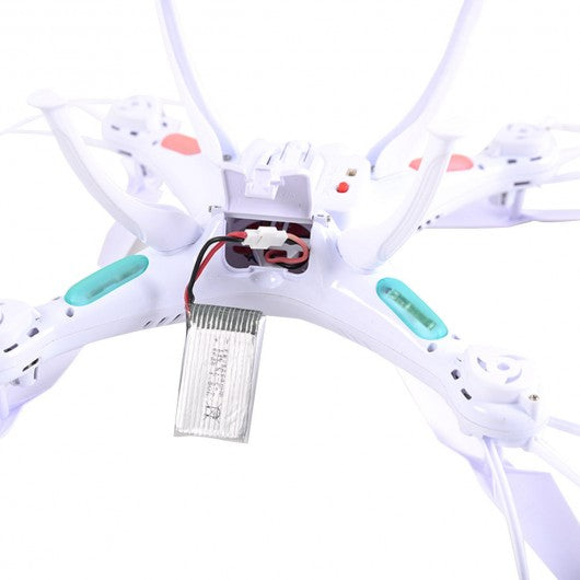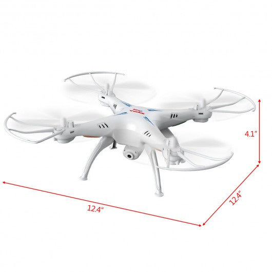 Specification: Color: White Body size: 31.5 x 31.5 x 10.5 cm (L x W x H) Frequency: 2.4 GHz Channel: 4 Charging time: 130 minutes Flying time: 5.5 minutes Control distance: 50 meters Battery: 3.7 V 500 mAh Li-poly Battery for controller: 4 x 1.5 V AA batteries (not included) Package includes: 1 x quadcopter 1 x 2.4 G remote controller 1 x 0.3 MP high-definition camera 4 x main blades 4 x landing skids 4 x protecting guards 1 x phone attaching clamp 1 x USB charging wire 1 x instruction manual 1 x screwdriver
