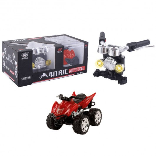This delicate...is a terrific choice to cheer your kids up which shall bring endless joyfulness to them by playing it.   This is our brand new 4D RC simulation remote control ATV quad motorcycle which comes with a motorcycle head-shape simulation remote control that will be a perfect gift for your children. It has the full function for controlling forward backward turn left turn right and stop simulation light sound effect vibration 360 degree rotation.   If you are looking for such a toy for your children don't hesitate to buy one.   New brand and high quality Simulation motorcycle head-shape remote control Full function: Forward backward turn left turn right and stop simulation light sound effect vibration 360 degree rotation Hand brake function All-terrain vehicle 2 control mode: Manual mode and gravity induction mode Color box packing Suitable for children ages 6+
