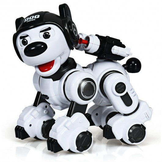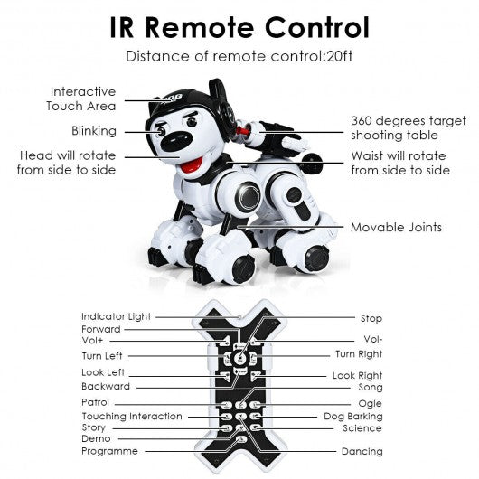 This remote control robotic dog with excellent appearance is a great gift for your kids! It features multiple functions such as interactive touch programmable singing and dancing blinking shaking the head forward/backward turns left / right storytelling etc. With these interesting functions it accompanies kids to explore more fun. Moreover the remote control allows kids to train and guide their remote-controlled toy puppy. It comes with USB charging cable which can be connected to a computer power bank and USB adapter. If you are looking for a robotic dog for children don't hesitate to buy one now! Multifunction robot dog can sing and dance launch toy bullet stories telling popularization of science etc. Equipped with remote control you can control the dog easily Made of high-quality and safe ABS material it is durable and safe It has 5 songs and 3 dance music so children can dance together with it Varied interesting action design: forward/backward turn left/right turn waist and leg joints The missile can shoot in all directions through 360-degree target table Touch head of the robot puppy toy and it will begin a simple interaction with you Have more amusing functions like blinking eyes and shaking head Robot puppy toy could display corresponding action by programmed With ASTM certification safeguard material safety