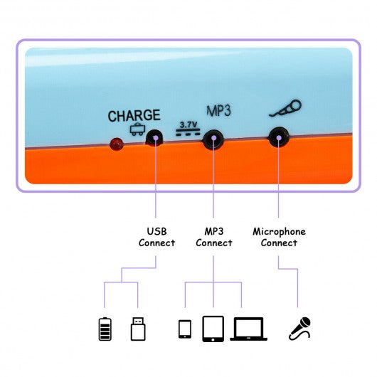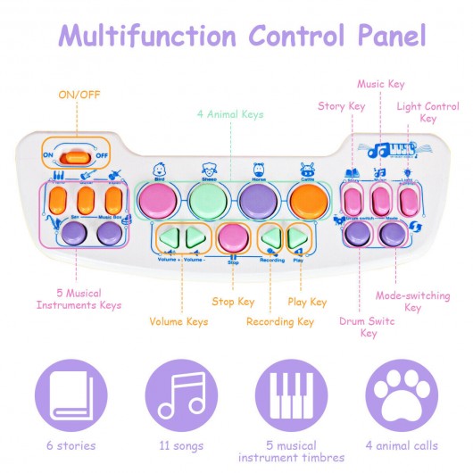 This piano toy can be not only a toy but also a musical instrument that helps to develop children's interest and love for music and inspire their creativity. This beautiful piano toy is a great educational toy for your kid! The toy consists of two instruments a drum and a piano. It is also equipped with a microphone to show the child's musical talent better. There is a music fountain in the middle to quickly catch the child's attention. Made of stable ABS plastic which have traits of health wear resistance and durable. This children musical piano toy is the best gift for your baby. If you are looking for the piano toy for kids don't hesitate to buy it! Consisted of 6 funky jazz drums and a musical piano The illuminated music fountain can generate water columns based on the volume of the music External MP3/iPad/Cellphone available it could as a mobile audio It's help to enhance brain development and benefit sensory and visual. Multiple functions: 5 musical instruments keys 4 animal keys music keys story keys light control keys etc. Adjustable microphone to show your baby's voice better Recording and playing function improves children's learning ability Two power supplies: built-in battery and USB direct charging Made of high quality ABS material for long term use Equipped with a sturdy stool and piano stand With CPSIA and ASTM certifications can be used with confidence Easy to assemble and move NOTE: The color of the product parts is random allocation (Blue yellow red orange purple ).