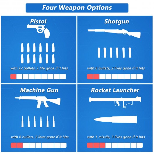 Specification: Gun color: White Blue Material: ABS Gun size: 9.5" x 6.5" x 1.5" (L x W x H) Net weight: 1 lb Using distance: 50ft Package includes: 2 x Gun 2 x Walkie talkies 1 x Helicopter 1 x USB 1 x Instruction