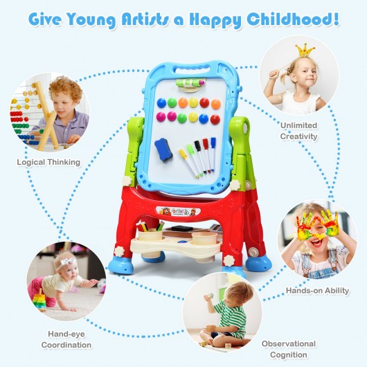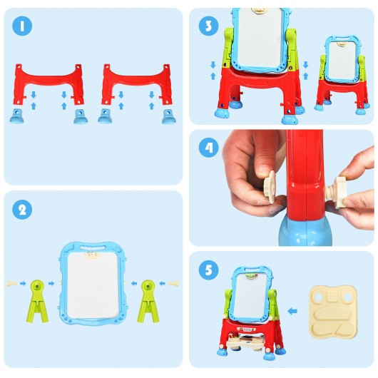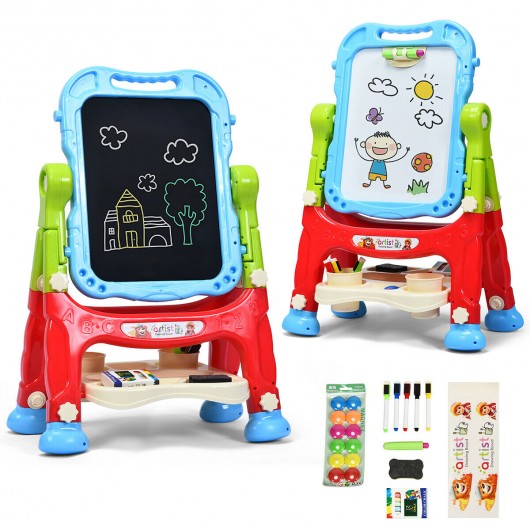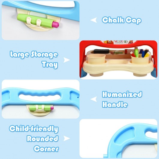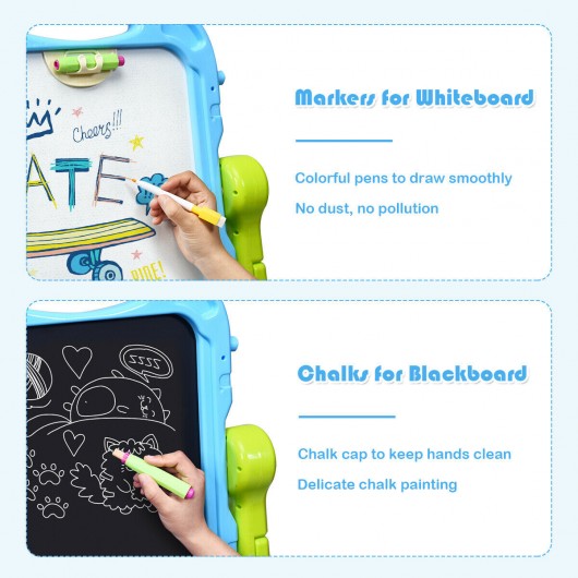 Equipped with magnetic whiteboard and chalkboard young artist can draw with his/her best friend to promote friendship. 360° rotating design allows kids to switch freely and add more fun. Environmentally friendly PP material and stable triangle structure ensure good safety for kids to use. The storage tray is spacious to place chalks markers eraser magnetic beads and so on. Detachable drawing board with handle allows kids to carry it and draw anywhere. Cute colors will attract little artists to stimulate their imagination and create more works. If you are looking for wood furniture set like that don't hesitate to buy it. Double-sided whiteboard and chalkboard to support separate painting 360° rotatable adjustment and smooth track for easily switch Environmentally friendly PP material for safe use Triangle construction to ensure excellent stability Certificated by ASTM for good safety Erase and magnetic beads can be attracted on the magnetic board Detachable from frame to use as a hand held drawing board Chalk cap to keep hands away from chalk dust Large storage tray to put art accessories in order Paper clip to clip drawing paper and chalk cap for multifunctional use Comes with eraser chalks magnetic beads markers cups and chalk cap Suitable for children over 3 years old Perfect for kids' art activities in classroom preschool playroom etc Improve child's imagination and creativity Enhance interaction to paint with friends Easy to assemble and store
