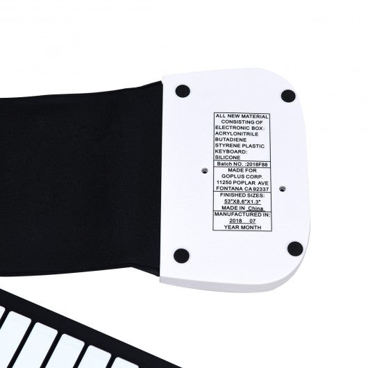 Specification: Color: White/Black Material: Silicon Keyboard model: 88 keys Tone: 128 Rhythm: 128 Demonstration songs: 15 Powered by: 1.USB 5V external power supply 2. Built-in 1200 mA lithium battery Overall length of the product: 53.5" Keyboard dimension: 49.5" x 6.3" (L x W) Control box dimension: 7.5" x 4.5" x 2" (L x W x H) Net weight: 4 lbs Package includes: 1 x 88 keys roll up piano 1 x Power adapter 1 x Foot pedal 1 x User manual