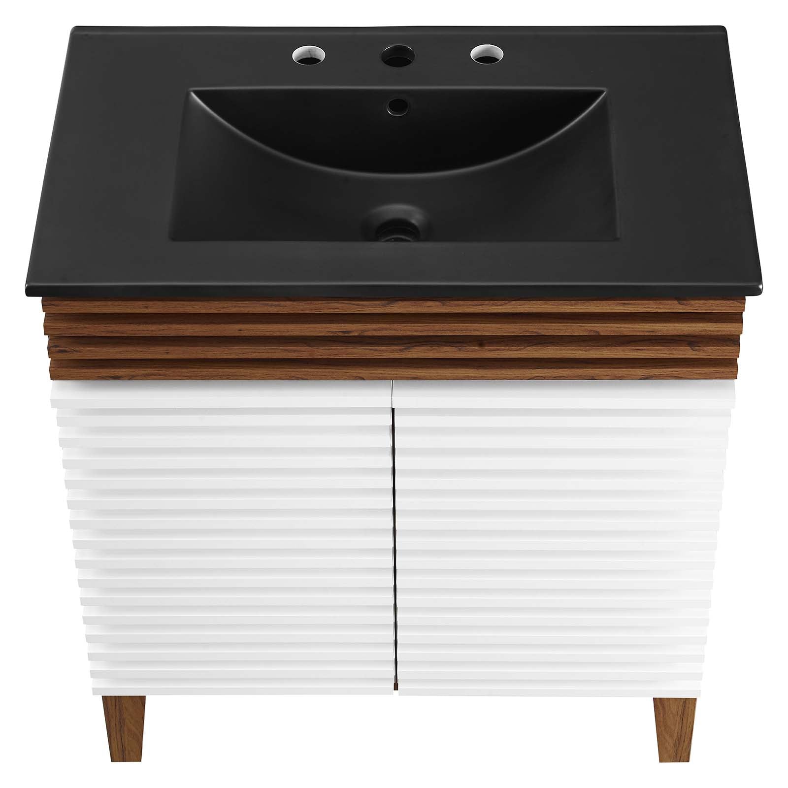 Tap into mid-century aesthetics with the Render Vanity. Render Bathroom Vanity features a durable particleboard frame with smooth laminate, four tapered wood legs, and adjustable storage shelf behind two soft-close hinged doors. A curved ceramic basin and integrated countertop with three faucet holes create sleek lines and crisp design for an edgy style designed to meet your needs. Boasting a mid-century modern style this vanity features a solid construction with a pleasing look and practical functionality. 8" centerset faucet holes. Assembly required and fixtures not included. Set Includes: One - 30" Ceramic basin top One - 30" Vanity cabinet