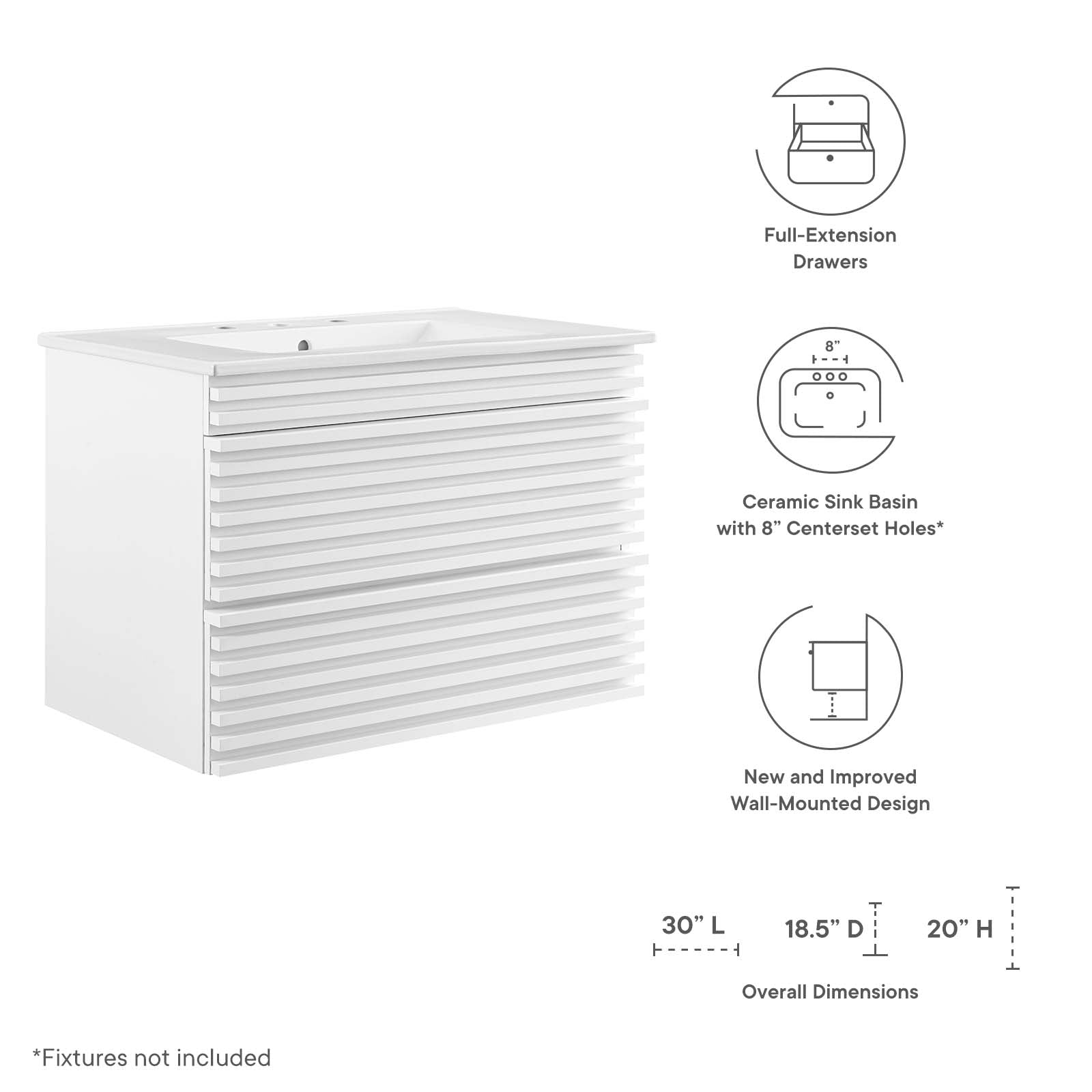 Tap into mid-century aesthetics with the Render Vanity. The Render 30" Bathroom Vanity features a durable MDF and particleboard frame with smooth walnut grain laminate, ample storage space in two full-extension drawers, and space-saving wall-mount design. Crafted with ceramic, a single sink with an integrated countertop, 8" centerset faucet holes, and rectangular sink basin continue the sleek look of this retro modern vanity. Clean lines and crisp design align for an edgy style designed to meet your needs. Boasting a mid-century modern style this vanity features a solid construction with a pleasing look and practical functionality. Assembly required and fixtures not included. Set Includes: One - 30" Ceramic Basin Top One - 30" Wall standing Vanity cabinet